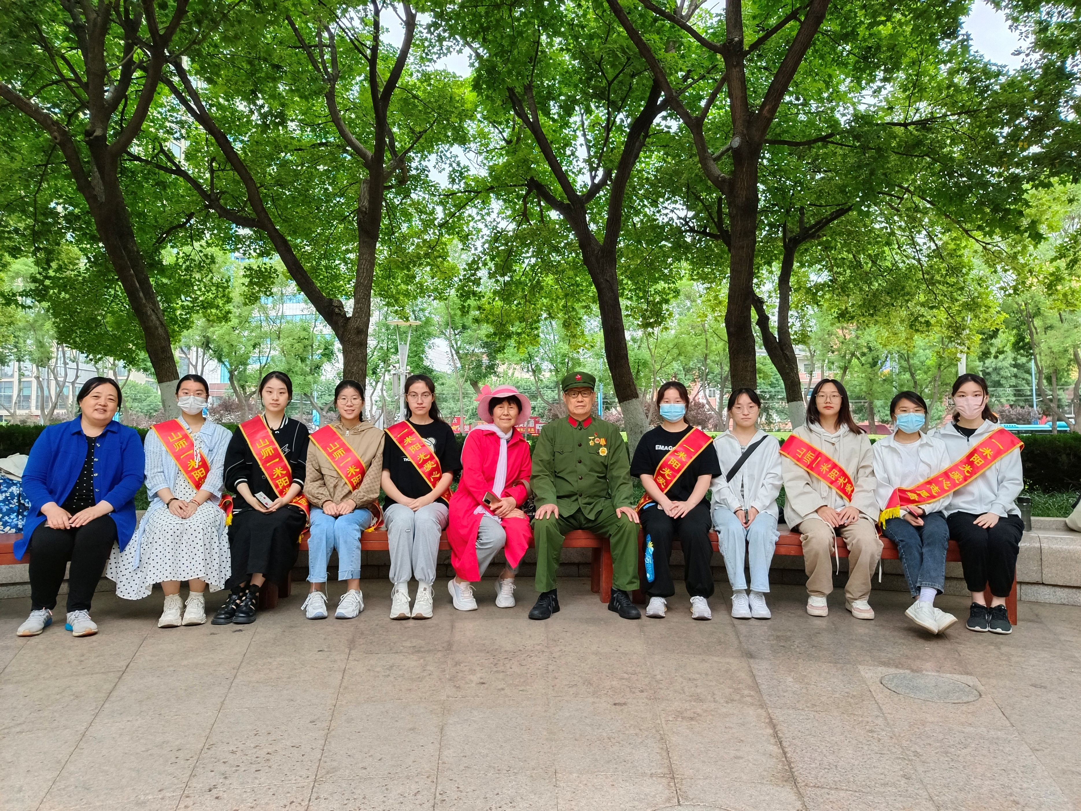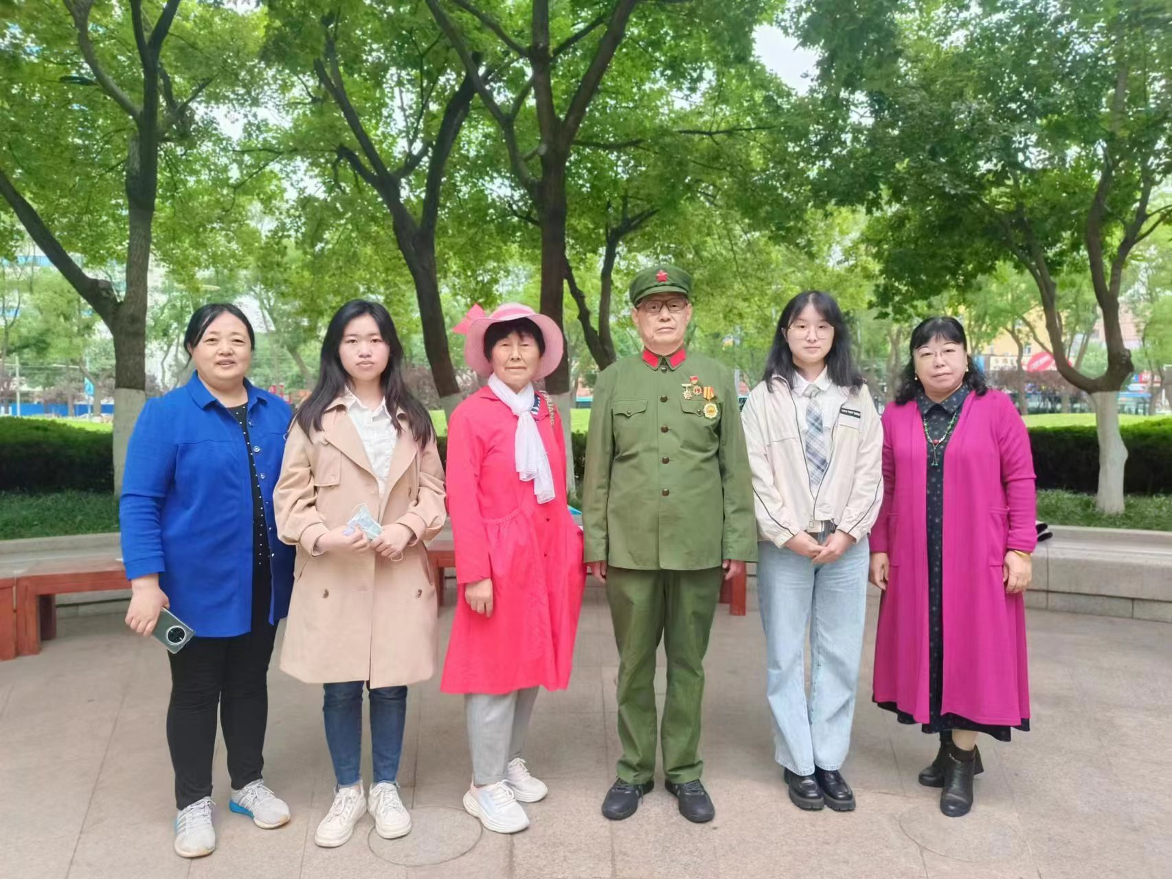 不多时雨停了,泉城广场西南处的小树林休闲广场上一位身穿军装、戴着军帽、胸前佩戴着三枚奖章的退伍老兵正在为山东师范大学、济南大学的部分大学生们上一堂生动的爱国主义教育课。