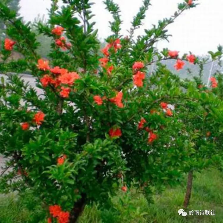 挺立园中绿叶稠,榴花怒放彩云羞。