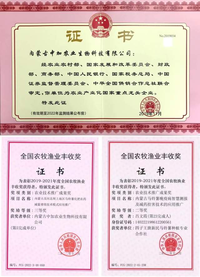 该公司十几年来专注马铃薯种薯的研发,年可生产脱毒马铃薯种苗6500万株、原原种1亿粒;研发的11个新品种,获得了多项国家专利,其中有4个品种得到了广泛的应用和推广。其中“中加7”亩产达到4.5吨,“中加11”出粉率在18%—25%之间,平均能达到22%。