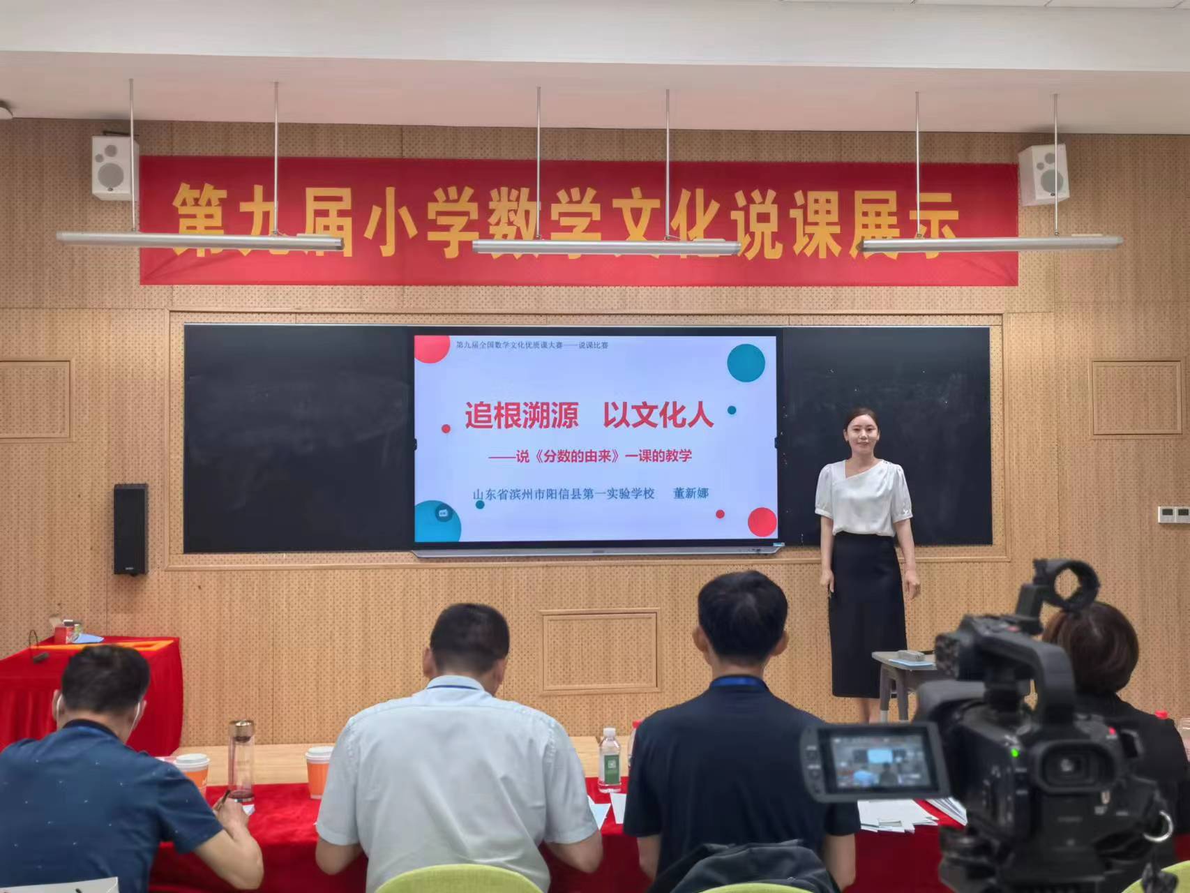 阳信县第一实验学校数学教师董新娜是通过层层选拔,代表山东省参加了此次现场说课展示。在本次数学文化说课类比赛中,展示了《分数的由来》一课。董老师以独到的设计、自信的姿态,精美的多媒体展示,既体现出了文化的魅力,又体现出数学的严谨、理性与趣味性,得到了评委和现场参会教师的一致好评,喜获全国一等奖。