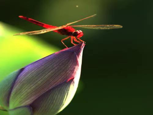 尖尖新荷戏蜻蜓,老翁吟诗醉花旁。