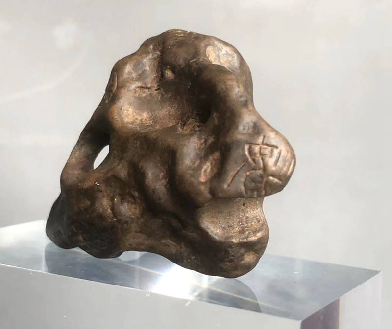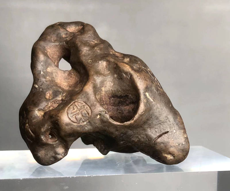 一、袖石尺寸6.5厘米(直径),重量56克。石质为水冲石,色泽深褐,质地坚硬,但叩之声闷,石种待考。