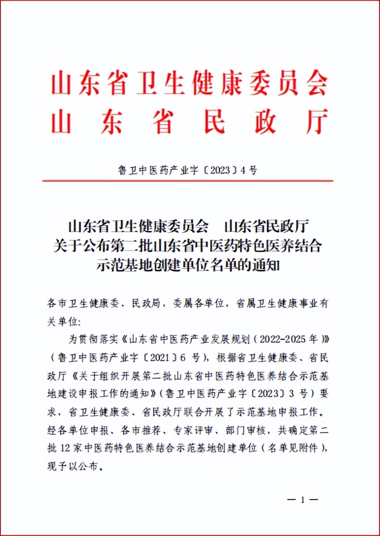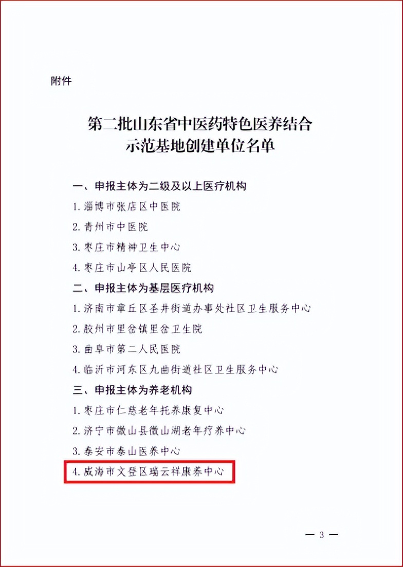 近日,山东省卫生健康委员会、山东省民政厅下发《关于公布第二批山东省中医药特色医养结合示范基地创建单位名单的通知》(鲁卫中医药产业字〔2023〕4号),威海市文登区瑞云祥康养中心是全省4家入围的养老机构之一。
