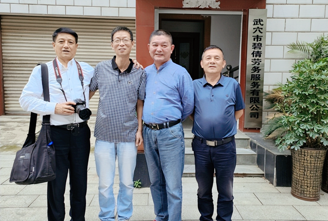 《今日黄冈》特约记者 田树兵 胡均星 湖北武穴报道:认识曹晓武(左2)、高建强(右2)、刘汉秋(右1)将近20余年了。老友相见,皆大欢喜。上周末,走进这家耳熟能详的武穴市碧倩劳务服务公司时,得知全国劳模、祥云集团董事长胡华文是“铁粉”。一个语言质朴,思想深邃,外表温和儒雅,言谈举止散发出浓浓学者气息的曹老板,他自豪地说:“回想起当年从工行下海创业的事情,让我感慨万千。公司创办之初,包括自己就那么几个人,而且资金运转困难,可谓创业之初之艰辛”。