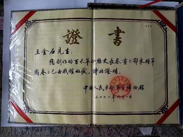 那天,是他终生难忘的2001年“六一”儿童节, 军博给金石先生办好相关手续,并且颁发了《鄂东将军图卷》《收藏证书》,这标志着他这个基层画家的生命之作,正式进入国家军史艺术最高殿堂,正式被中国人民革命军事博物馆收藏了!“将军图”名至实归,回到了她真正的家!送它回家的金石先生和老伴更是高兴得心花怒放!