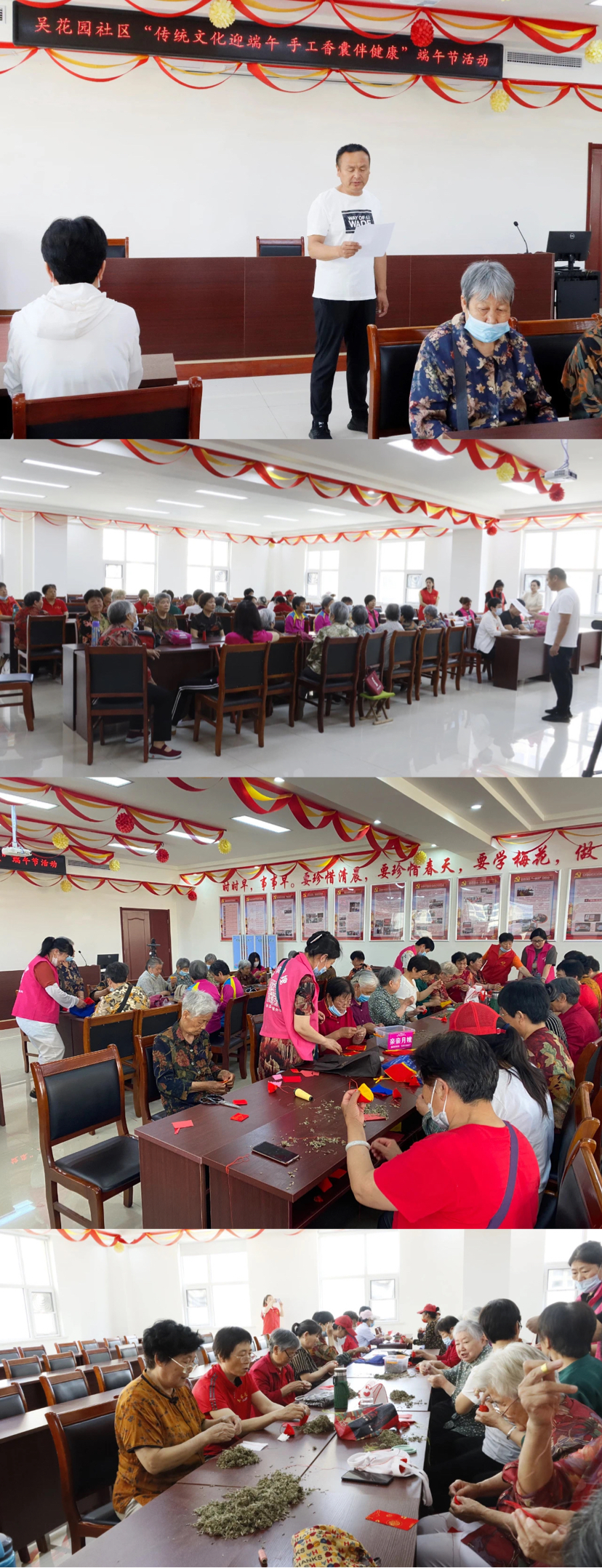 活动开始前,吴花园社区党委副书记吴志强致辞,祝所有居民端午安康。本次活动以端午节为契机,以党建为引领,巧手居民们制作着艾草香囊,笑意写在脸上。活动现场,社区工作人员带领居民们一起追溯端午节的由来,还介绍了香包的材料作用和制作环节。随后,大家纷纷开始了香包制作环节,彩布缝合,系绳打结,链接流畅,填充香料……转眼之间,一块块彩布就变成了一个个造型可爱的、立体饱满又精致的香包。