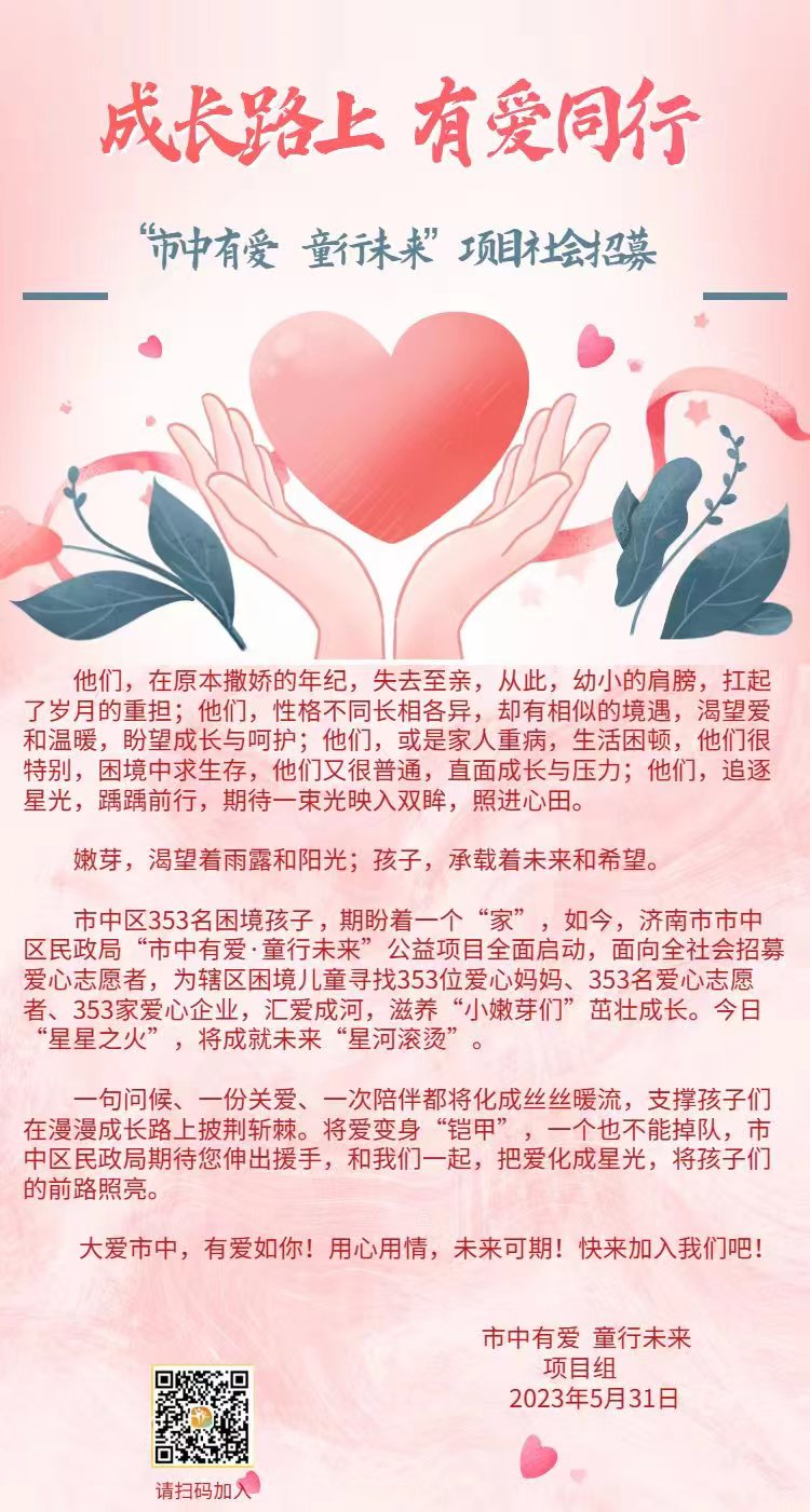 济南市市中区民政局期待您伸出援手,和我们一起,把爱化成星光,将孩子们的前路照亮。大爱市中,有爱如你!用心用情,未来可期!快来加入我们吧!(长按图片二维码填写报名信息)麻烦大家帮忙转发,谢谢!