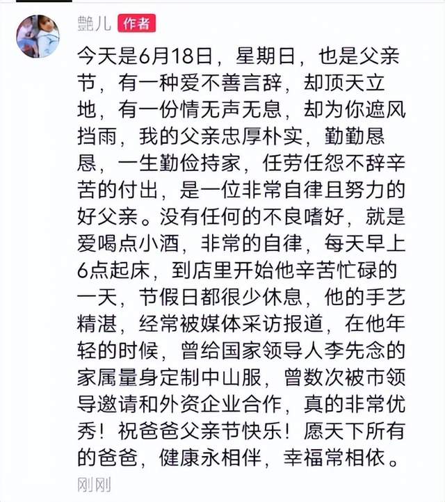 在他年轻的时候,曾给国家领导人的家属量身定制中山服,曾数次被市领导邀请和外资企业合作,真的非常优秀!祝爸爸父亲节快乐!愿天下所有的爸爸,健康永相伴,幸福常相依。(熊艳)