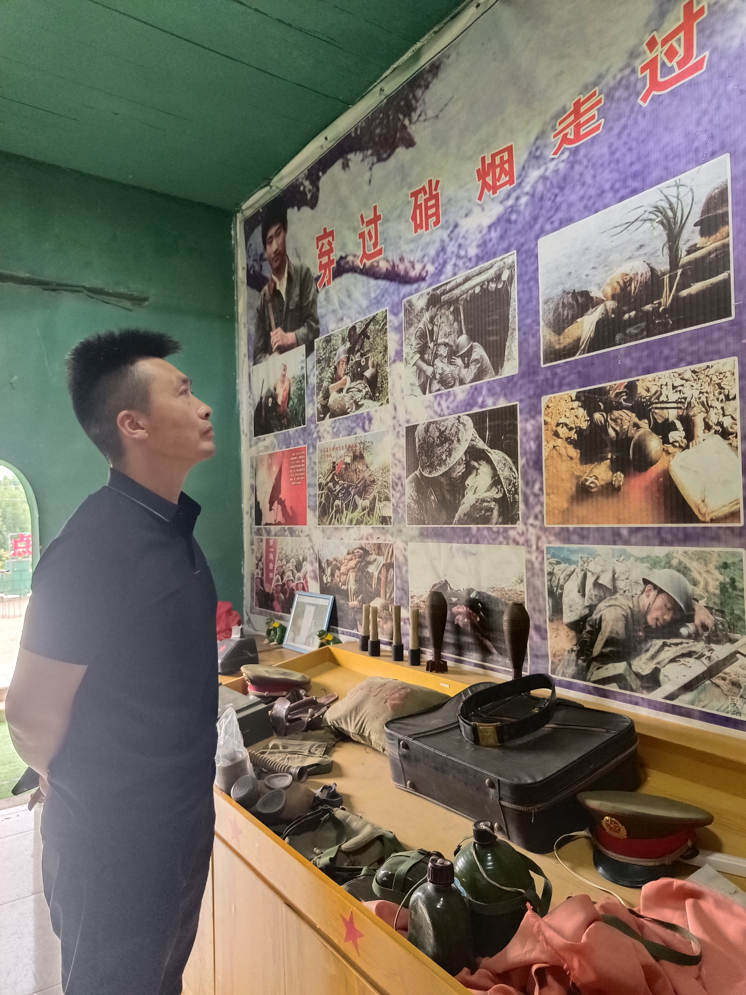 演出结束后,大家开始参观猫耳洞红色教育基地,参战退伍老兵王恩亮为大家一一讲解,一幅幅图片,每一张图片背后都有一个感人的故事,图片“死吻”感动了在场的所有人,战争是多么的可怕,夺走了多少人鲜活的生命,为了祖国的安危,人民的幸福,他们舍小家,顾大家,不顾个人安危,义无反顾奔赴战场,英勇杀敌,保家卫国,壮烈牺牲,大家向烈士默哀并鞠躬致敬。老兵王恩亮为大家讲解了观敌台、老山前线帐篷小学、猫耳洞等。