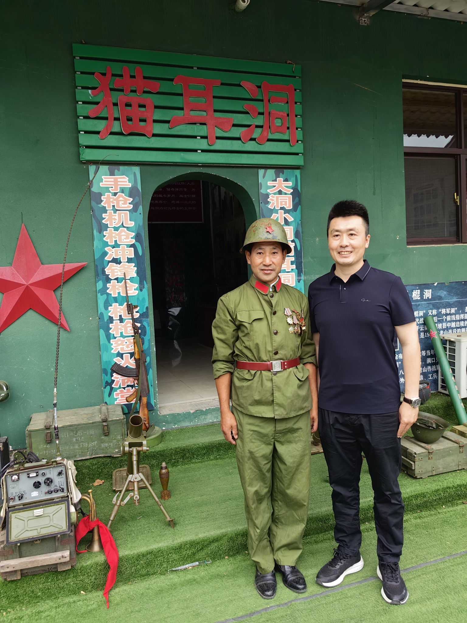 走进老兵之家,大家就被红色教育基地吸引住了。猫耳洞门口摆放着枪支、爆破筒、电台、弹药箱、钢盔等,一副对联仿佛把人们带入那场战争:大洞小洞猫耳洞洞洞藏龙卧虎,手枪机枪冲锋枪枪枪怒火满堂。大家纷纷想和参战退伍老兵王恩亮合影。谁不想和最可爱的人合影留念啊!兵妈妈赶紧招呼大家,演出结束后给大家留出合影的时间。演员赶紧装扮上,演出马上就要开始了。