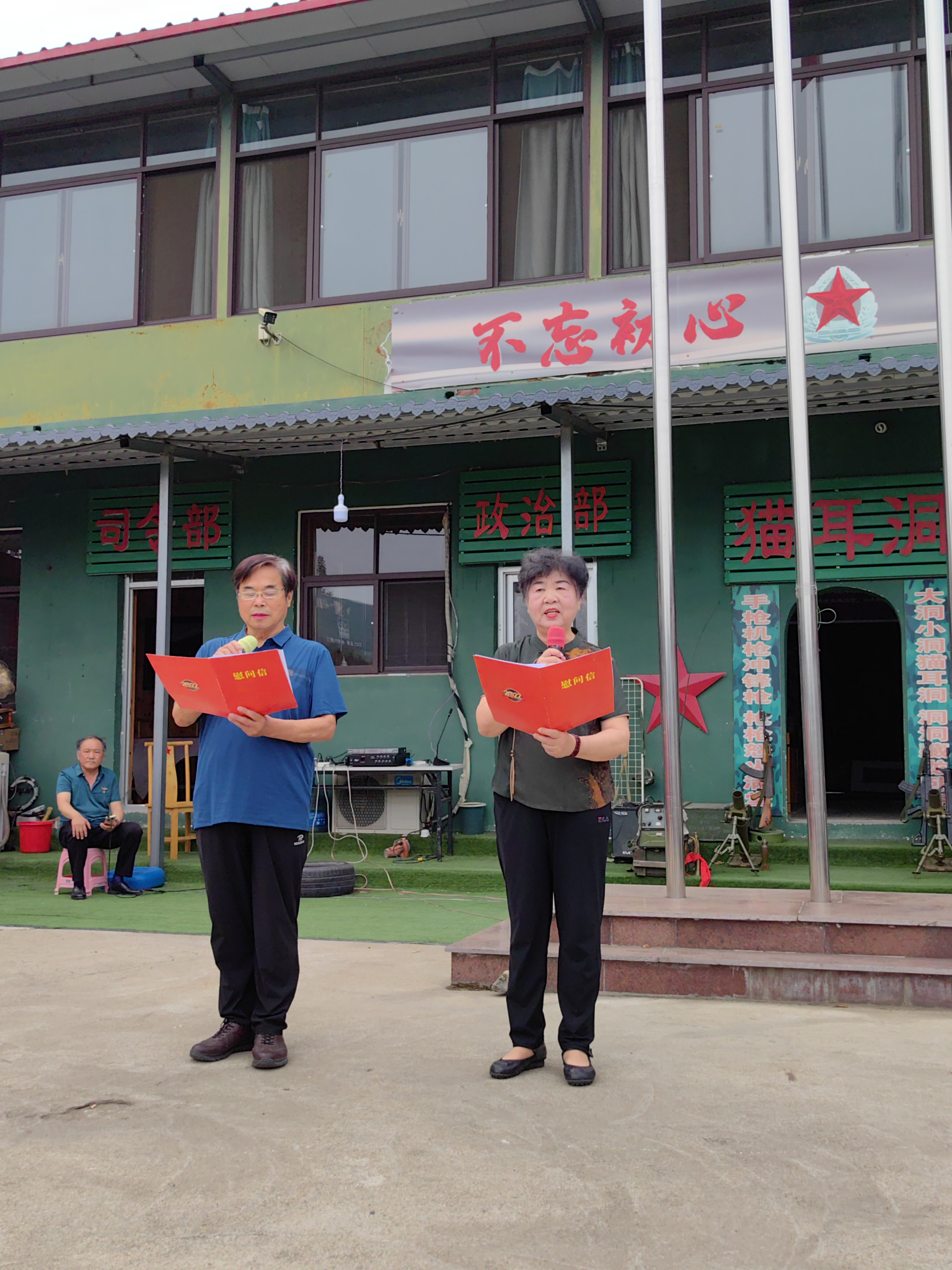 济南这几天一直是高温天气,连续几天气温在38℃,艳阳高照,骄阳似火,烈日炎炎。6月17日的早上气温却没有那么高,阴天,还有点微微小风,天公作美,兵妈妈早早地赶到集合地点等候在那里,慰问演出的队伍一行三十余人陆续都到了,大家坐着大巴车一路向南,开往西营的方向行驶,一路上,窗外绿树成荫,花儿微笑,风景优美,路过村庄,看到树木上结满了果子,路边有卖桃的、卖杏的、卖新鲜蔬菜的,现在正是瓜果飘香的季节。一个小时的路程到了目的地老兵之家(猫耳洞),参战老兵王恩亮早已等候在那里,欢迎大家的到来。