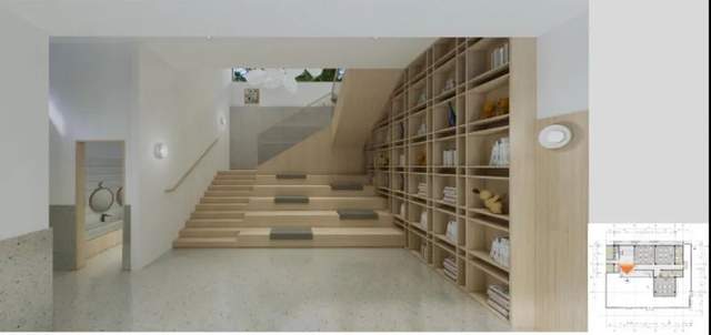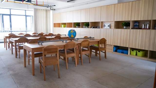 室内环境以木色、白色为主色调,自然简洁,优雅温馨,教室与走廊宽阔温馨,空间高大,室内光照怡人。