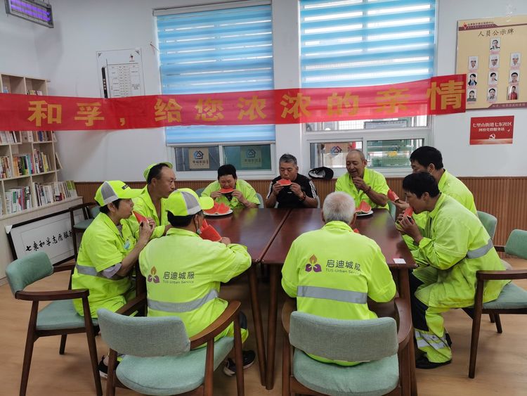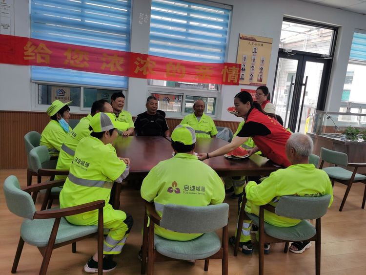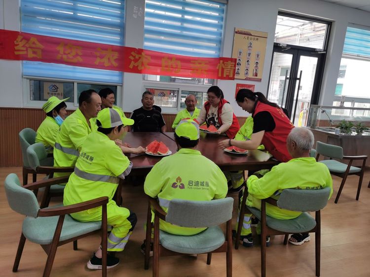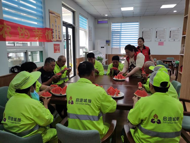 在活动现场,社区工作人员早早地为环卫工人们准备了清凉的西瓜,以缓解他们在炎炎夏日中的疲劳和口渴。社区工作人员提醒环卫工人们注意高温避暑,保重身体,让环卫工人们在炎热的夏季感受到了一份来自内心的清凉。