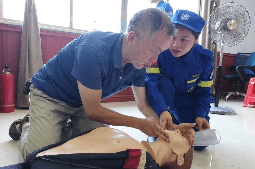当天上午,在该公司邵阳分司会议室,长沙市蓝天救援队队长亲自授课,一一示范,并和另一位队员配合演练。邵阳市生态环境保护志愿者联合会办公室主任曾健乾主动要求现场上场,现学现练,熟练掌握海姆立克急救法。