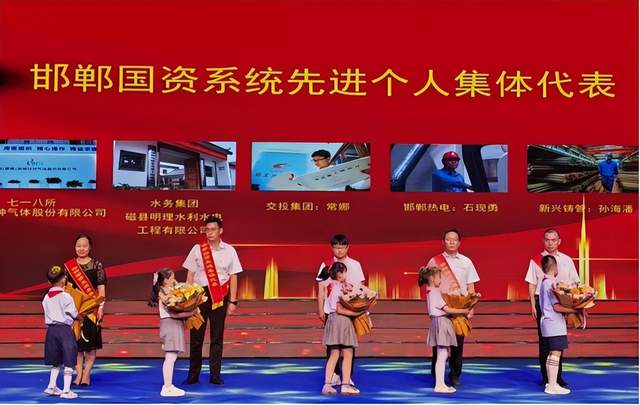 新兴铸管武安本级轧钢部四级技术专家孙海潘作为国资系统先进个人,其先进事迹在晚会进行了视频展播,孙海潘与其他企业先进代表一同上台接受了表彰,邯郸市优秀少先队员向他们鲜花致敬。