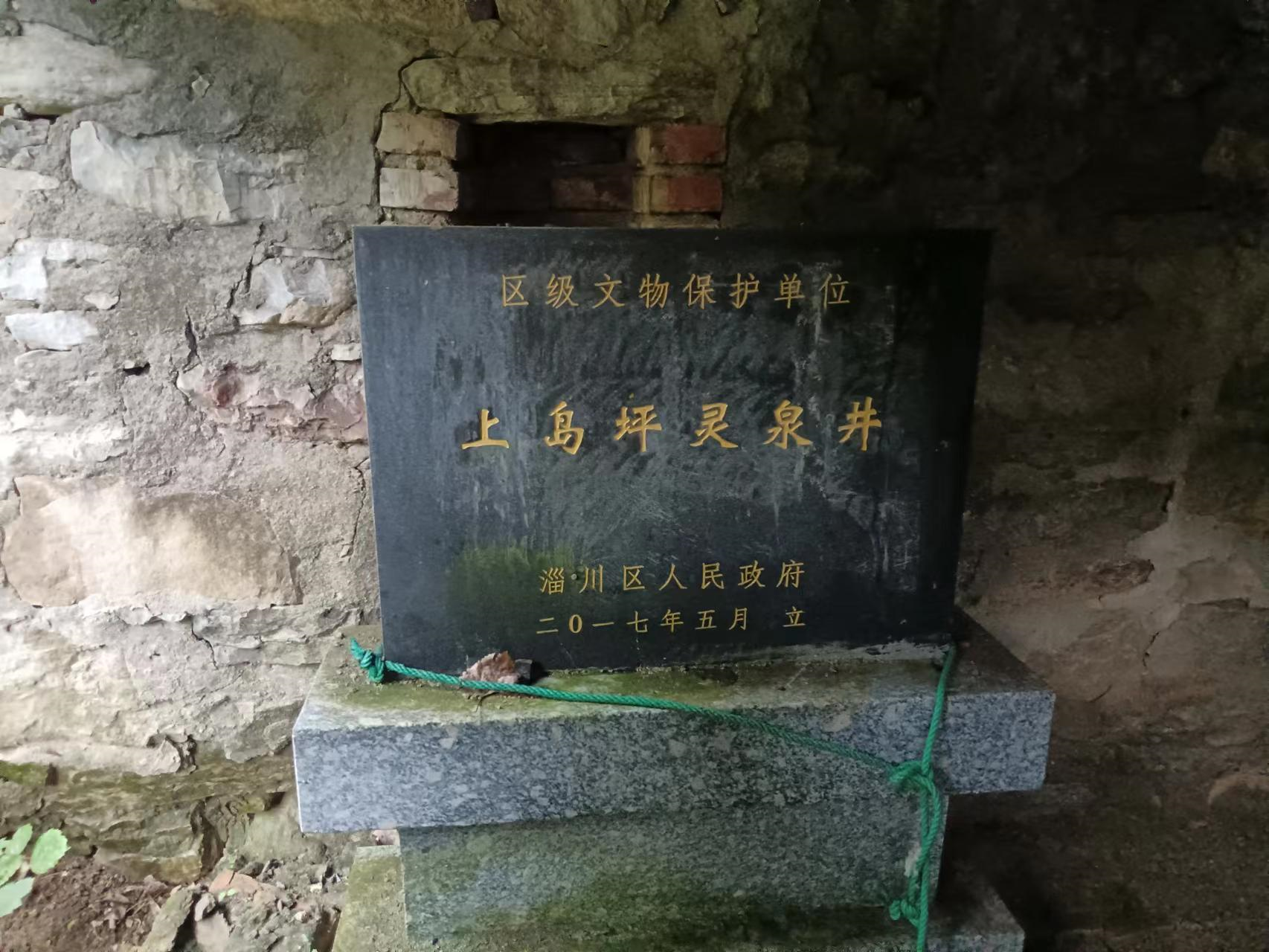 在村子向西的山峪中,有口距今100多年的老井,李书记证实,这口井便是李半仙点穴,村民挖了30多米,终于挖到了水。我们到达井的位置后,但见井被一棚子覆盖,朝南面敞开着。井口约半米见方,井下黝黑,深不见底。井上盖有青石盖板,还有提水用的井绳和辘轳。井西侧靠墙处立有一块新碑,上书"上岛坪灵泉井"五个鎏金大字,是区级文宝单位。井的东侧有一块老碑,记有当时参加打井人的名字。这正是: