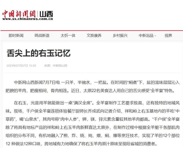 到底是什么样的羊肉,引得百万级粉丝网红美食大咖集结位于太原市南中环清控创新基地的千户侯全羊宴连锁体验餐厅,共同品鉴一桌全羊宴,用他们挑剔的舌尖感受来自右玉祥和岭上的地标有机羊肉。这样的大举动,目前在太原市尚属首次。