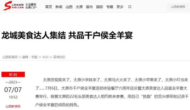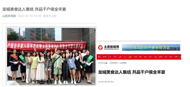 太原发现哥来了,太原小学妹来了,太原冯火火来了,太原小苹果来了,太原小叮当来了……7月6日,位于太原市南中环清控创新基地的千户侯全羊宴连锁体验餐厅六周年店庆暨太原美食达人品鉴全羊宴大赛举行。响誉太原的22名头部美食达人相约前来参赛,用自己“挑剔”的舌尖感受和记录千户侯全羊宴的成色和特色。