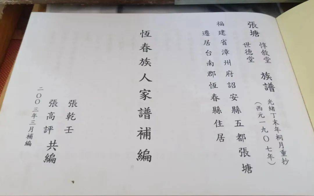 2012年,由福建省人民政府省长黄小晶带队,组织300多人到台湾开展声势浩大的闽台族谱续写对接。樟塘村老龄会的张明春、张福成也参加了该次活动。在台北见到了前来对接族谱续写工作的张乾壬、张高评先生,其场面异常热情,令人感动!双方族谱续写工作成功对接,互赠族谱。
