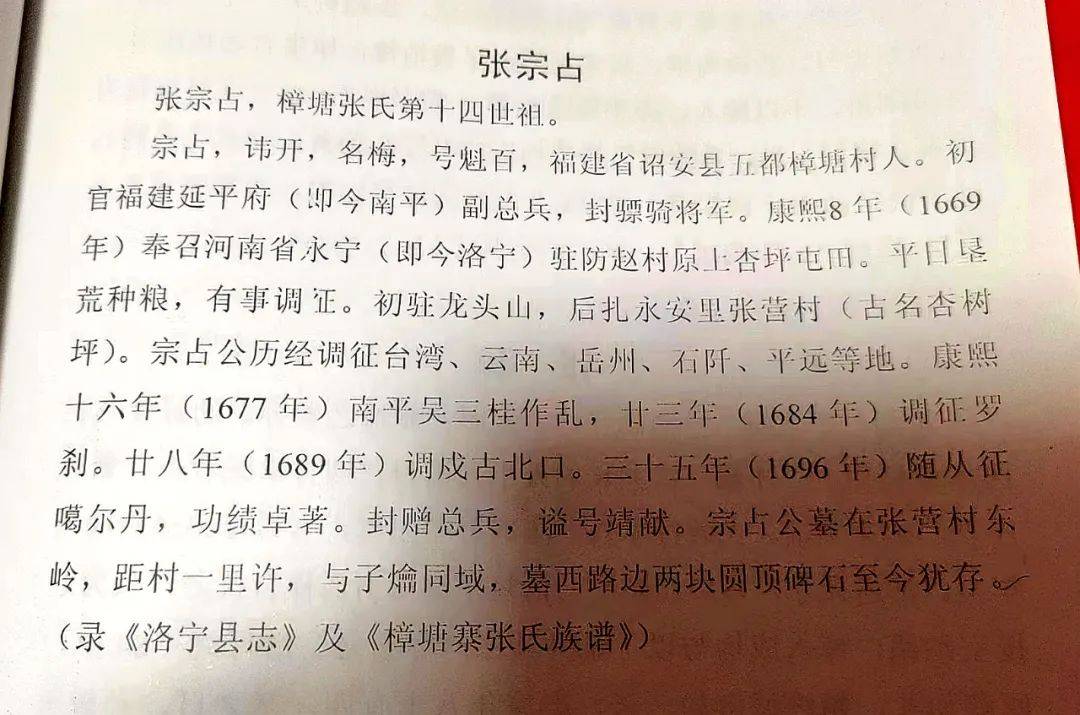 康熙八年,公率部、携妻、子晦仲(名爚,号葆光)一同来永宁。宗占公是为永宁县张营村张氏始迁祖。同时,樟塘村十三世祖体穆公之子宗荃公、参将,也移驻永宁县张营村。