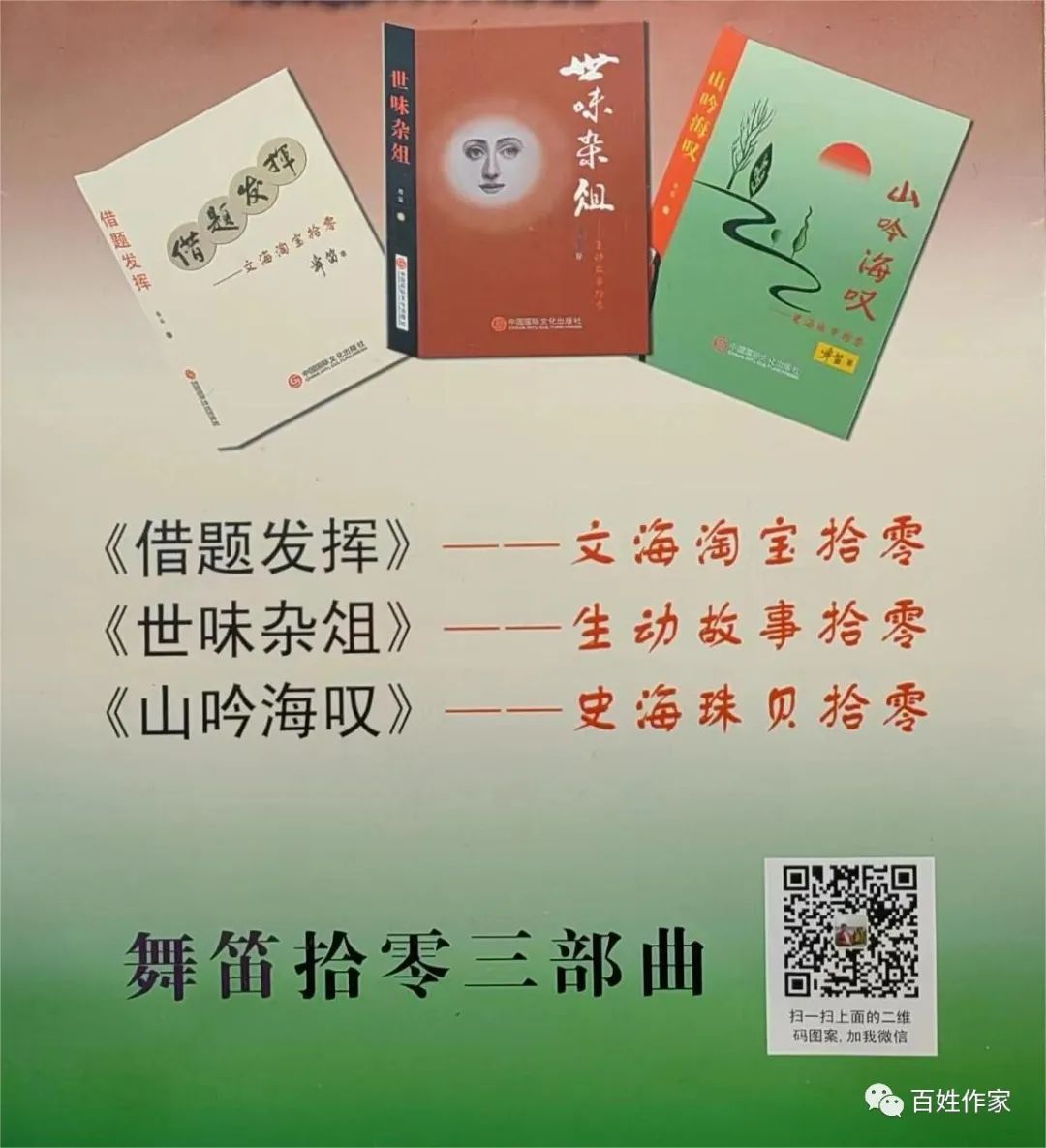 疫情过后,联系到了舞笛先生,原来就是咱们平顶山市作协卫东分会的副主席蔡全胜老师,一下子对上号了。真是“踏破铁鞋无觅处,得来全不费工夫”呀。蔡老师虽也是俗人一枚,但我认为他的思维还是高于我等常人。防疫封控过去了,联系得见,没成想人家不但早已出版发行了《人在旅途》和《借题发挥——文海淘宝拾零》等书,去年又“产下一对双胞胎”——《山吟海叹——史海珠贝拾零》和《世味杂俎——生动故事拾零》,这后两部与《借题发挥》并称为“舞笛拾零三部曲”,甚至还被网友调侃为“舞笛文学三胞胎”。约见后我请他品茶,他把他的“舞笛拾零三部曲”一并送我。天哪,吓我一跳,拿专用提袋装来三部书,足足有100万字,远不是我想象中的平常朋友,原来真人不露相,煌煌鸿篇巨制作家就在我身边,三部书皆由中国国际文化出版社出版发行。看来人家文怀沙老先生眼光就是毒啊!