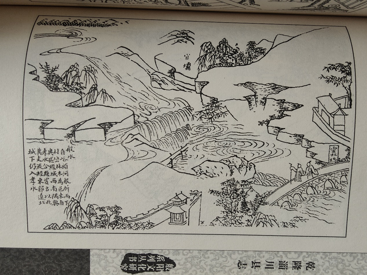 ——意思是:般河水从峪头河(又名渭头河。今渭一村青龙山下)曲曲折折(由南向北)流下来,一路穿山峦、绕村庄、经林木,创设了淄邑东南一片秀美之地。流过淄川城南在城西南面与孝妇河合流。般阳县(淄川古名般阳)就因此得名。它的支流经过城东又绕到北边往西仍然流入孝水(其实这不是支流,是明代县令侯居艮主持修的官坝将般河水分流了。今官坝尚存,水久已不分流。)