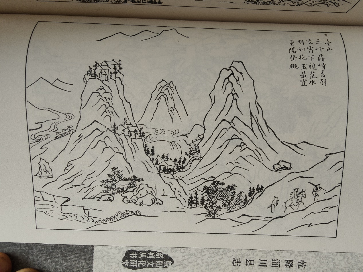 图中原文:三峰鼎峙,秀削凌霄。下視范水,明如拖玉。最宜重陽登眺。