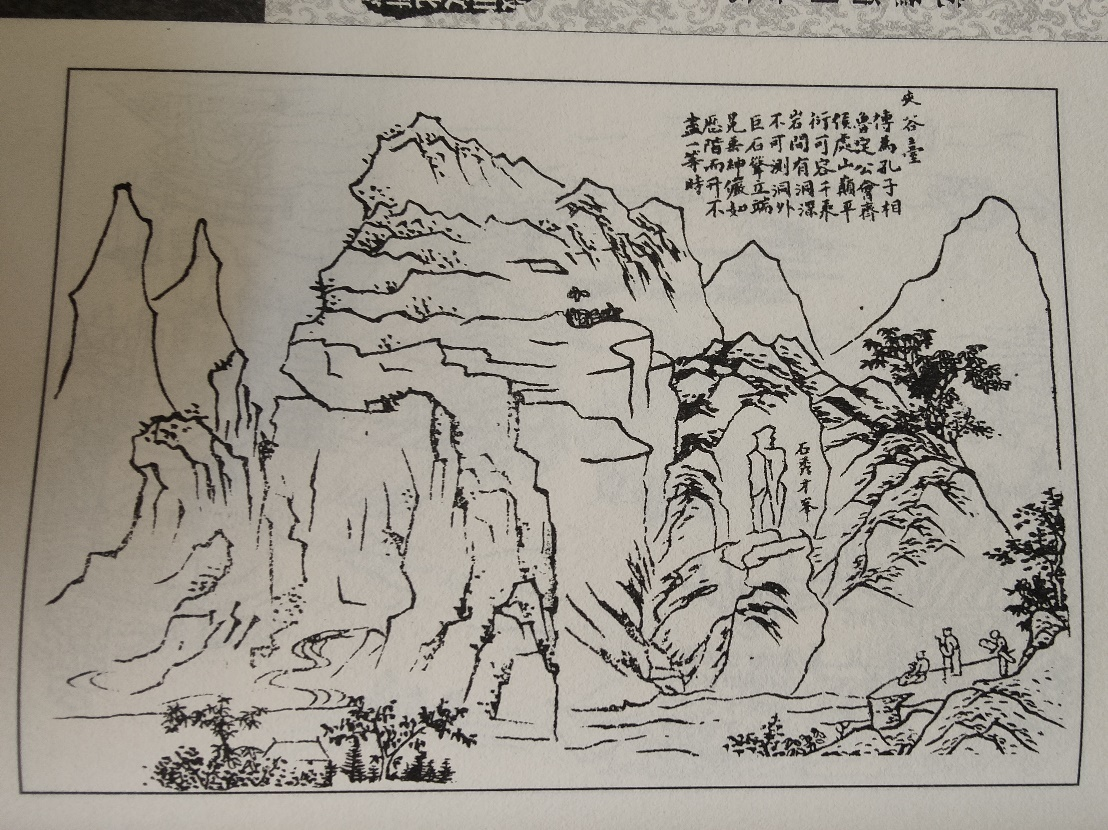 图中原文:傳爲孔子相鲁定公會齊侯處。山巅平衍,可容千乘;岩间有洞,深不可測。洞外巨石聳立,端冕垂紳,儼如歴階而升,不盡一等時(简体:传为孔子相鲁定公会齐侯处。山巅平衍,可容千乘;岩间有洞,深不可测。洞外巨石耸立,端冕垂绅,俨然历阶而升,不尽一等时。)