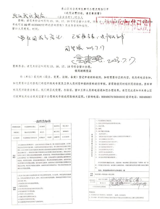 然后,工作人员受理了高建强提供的一系列申请材料,发放了《一次性告知书》和《社会团体名称预先核准申请书》,并就具体的工作流程与高建强作了一番探讨: