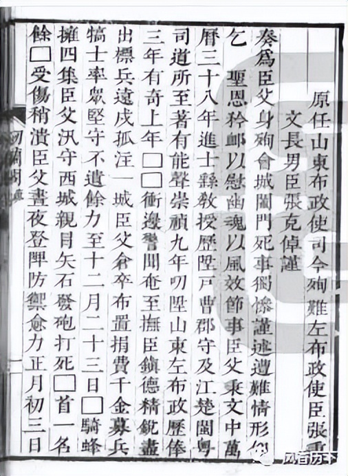 □□冲边,警闻奄至,抚臣镇德,精锐尽出。标兵远戍,孤注一城。臣父仓卒布置,捐费千金,募兵犒士,率众坚守,不遗余力。至十二月二十三日,(原缺,疑为虏)骑蜂拥四集,臣父汛守西城,亲冒矢石,发炮打死贼首一名,余者受伤稍溃。正月十三日,虏寇窥见西城坚壁,莫敢仰攻,舍西趋北,万矢齐发,百梯俱举,臣父驰兵奔救,内鲜同志,外绝救援,涕泣誓师,不与此虏俱生,巷斗格杀,手刃数贼,虏骑大至,众寡不敌,肋中数枪,身中五箭,力不能支,死西城内,暴尸城隅。