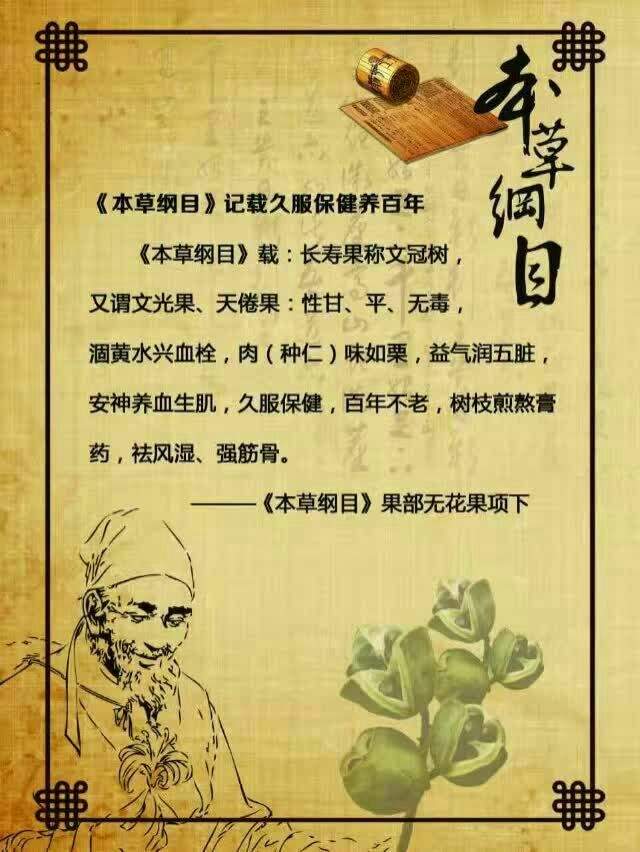 《本草纲目》载:长寿果称“文冠树”,又谓“文光果、天仙果”:“性甘平,无毒,涸黄水与血栓。肉味如栗,益气,润五脏,安神养血生肌,久服轻健,百年不老。树枝煎熬膏药,祛风湿,强筋骨。”