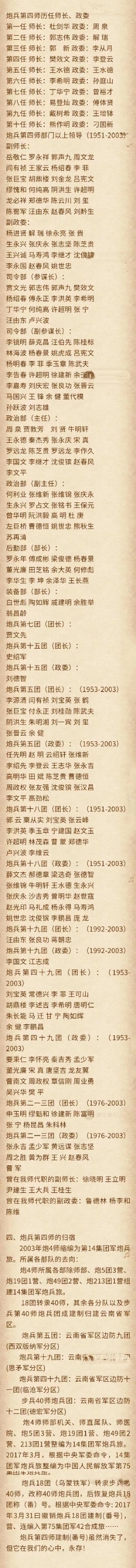 云岭之巅,千里边陲!炮兵四师,战争之神。解放战争,激战晋中,决战淮海,雄狮渡江。炮击英舰!两广战斗,挺进西南,英勇善战,不怕牺牲,神炮之师,战功累累,军旗飘扬,军歌嘹亮,炮四师雄风,永传四方。