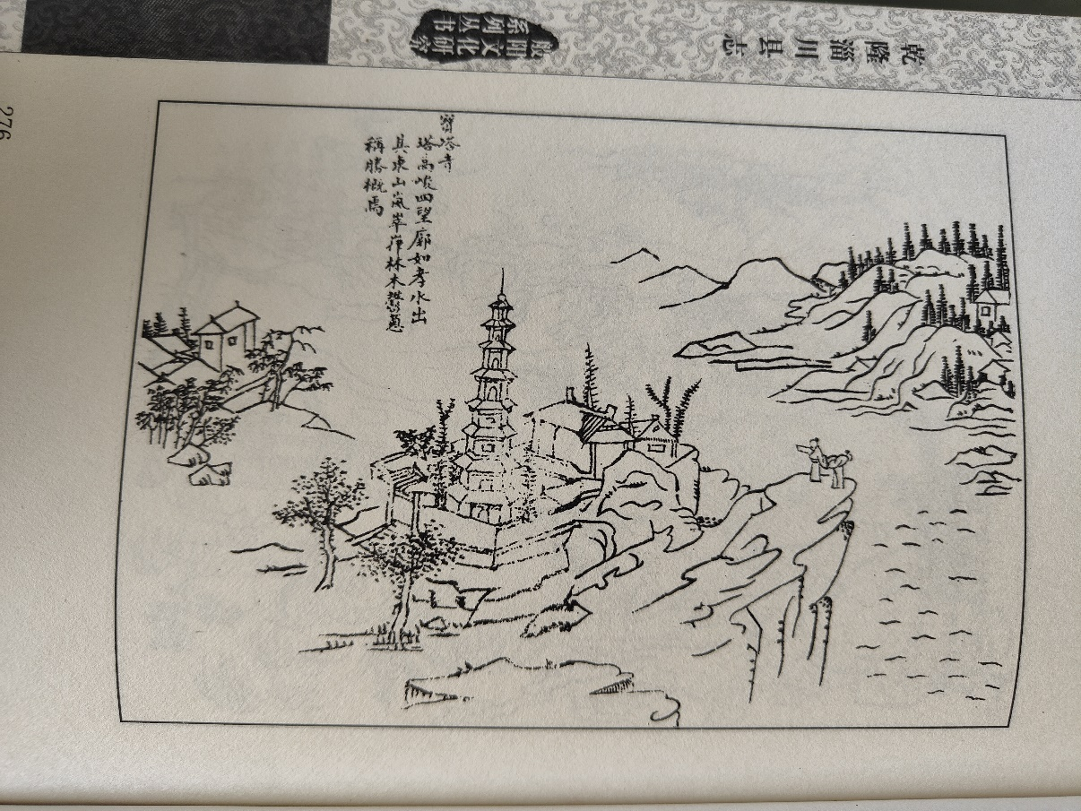 图中原文:塔高峻,四望廓如,孝水出其东。山岚崒嵂,林木鬱葱,称勝概焉。(简体:塔高峻,四望廓如,孝水出其东。山岚崒嵂,林木郁葱,称胜概焉。)