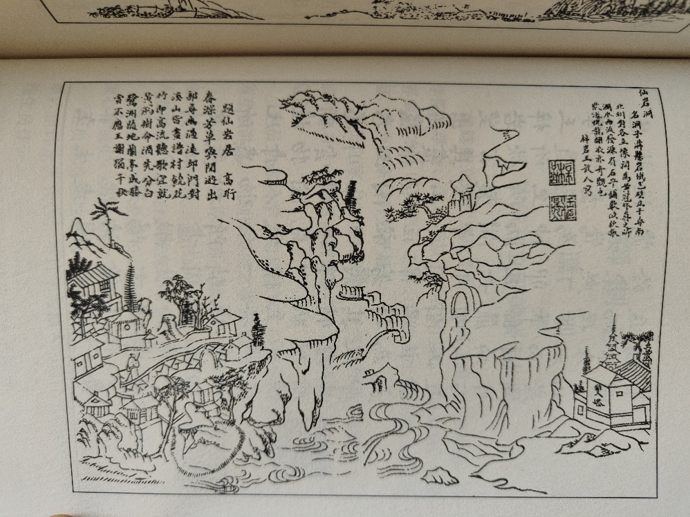 ——意思是:(仙岩洞)名叫洞子沟。黑褐色的悬崖,壁立千尺。一南一北两个洞对着,洞里都修有祠庙和神像,是道士修行的地方。有溪水往西流淌。发源处有块大石,平铺好几亩地大,秋季水涨瀑流倾泻,恍若腾龙翻浪,也是一大奇观啊! ——王敏入梓岩撰写