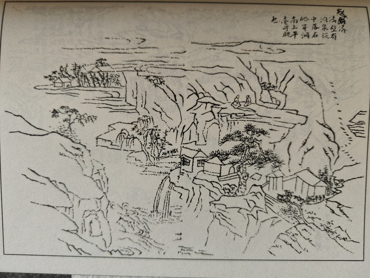 图中原文:溝壁有洞,泉从中落。石磴穿洞南上,平台可眺也。(简体:沟壁有洞,泉从中落。石蹬穿洞南上,平台可眺也。)