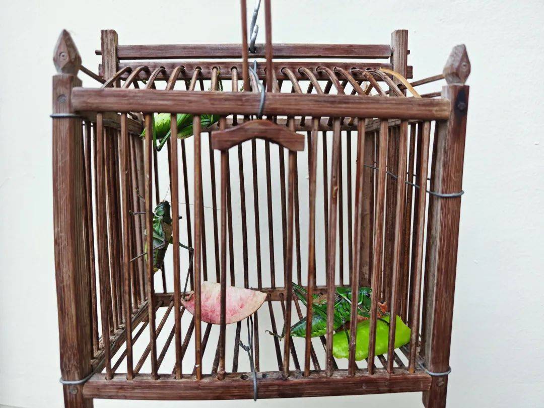 最大的那个三层楼房式笼子里圈着几只蚰子,有绿疙瘩,也有铁皮色蚰子,更多的是绿色的。有的正在抖动摩擦着脊背上的一对短翅,发出清脆悦耳的声音。车斗里放了一堆圆球型的塑料笼子,每个里边圈放着一只蚰子,笼子小得蚰子连转身都很困难,更别说蹦哒了。