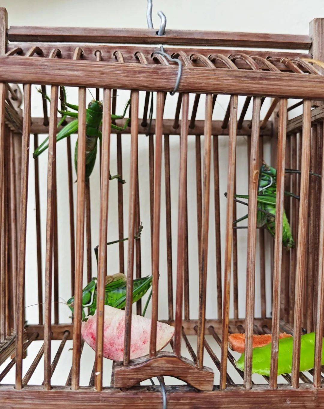 我挑选了三只蚰子,也帮小伙子又挑选了一个大大的笼子和三只蚰子,这三只蚰子从此成了我的又一牵挂。看着小伙子远去的背影,我认定他一定是个孝顺善良的人,他一定是把奶奶讲的玩蚰子的故事记在了心里。我猜想他奶奶的出身一定也是农村人,现在也许是吃穿无忧,她想要蚰子,是寻找她童年的一段记忆,寻找属于她们的那个年代,蚰子的叫声是伴随她童年生活的难忘音符。