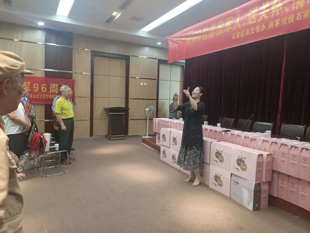 尚客优悦石家庄锦驿酒店长岗店副总经理康小丽讲话,并指挥大家合唱一首《咱当兵的人》。志愿者们为退役老兵发慰问礼品。