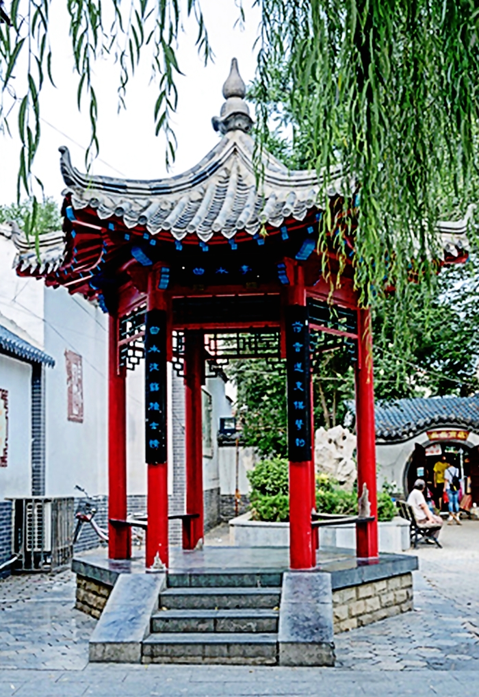 济南有一条曲水潺潺穿街过,两岸人家枕泉居的老街。此街即为曲水亭街。早年间的曲水亭街,地处府城中心地带。位于大明湖鹊华桥码头以南,清末山东巡抚衙门(今珍珠泉大院)以北。粉墙黛瓦,小桥流水,岸柳垂荫,清幽静谧,向为文人雅士游乐之地。两岸青堂瓦舍之间,散布着不少临街门头房,除柴米油盐之类小店外,多为旧书肆、笔墨庄、字画铺、古玩店。如有什么“鉴古斋”“敬古斋”“和顺斋”等商铺字号达十余家之多,可谓一街文墨风流。