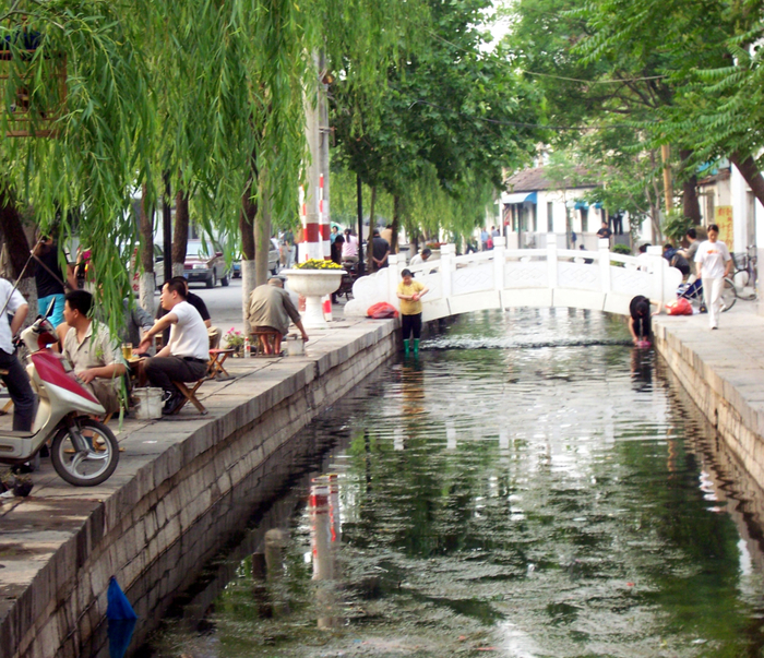 而此时的赵家棋茶馆也不是一座八角亭子,而是一座平房式水榭。水榭为三开间木制敞厅,坐东朝西,三面轩窗,四壁书画。厅下十几根支撑木桩打入河底,将其托于水面之上。厅前另设小木桥直达街河西岸。茶社内安放七八张吃茶的方桌,可容三四十棋客四散坐着品茶对弈。热天里,临窗而坐,四下流水清清,凉气袭人。两岸古柳婆娑,瓦舍栉比。厅内茶烟袅袅,棋声起落,甚是清心爽目。