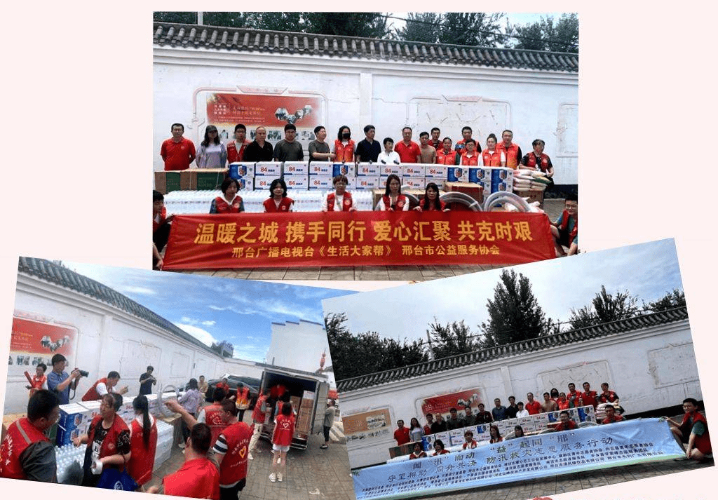 邢台市是河北省的重要交通枢纽和农业产区,此次受灾严重。在共青团邢台市委副书记薄弋峰带领下,由共青团宁晋县委书记孙红扑、邢台市公益服务协会会长靳国彬、副会长赵军凯、李丽红、秘书长张瑞虎、岳爱缺等人的陪同下,组织 40 名志愿者,分别向宁晋县河渠镇镇政府、河渠中学安置点、大曹庄镇镇政府送去了防汛救灾物资,全力支援宁晋县抢险救灾和灾后重建工作。