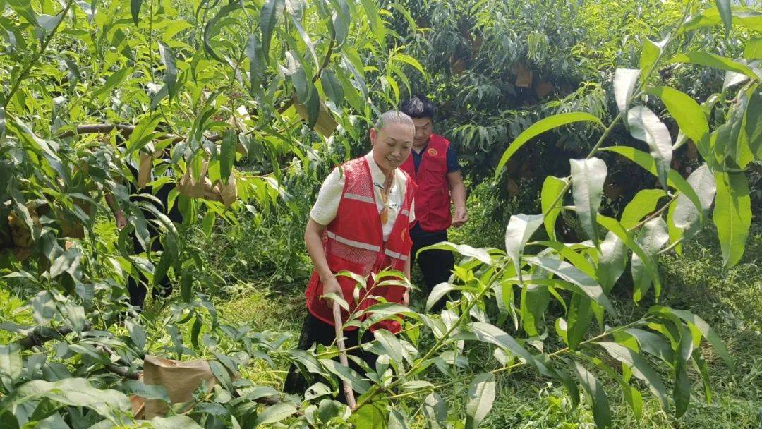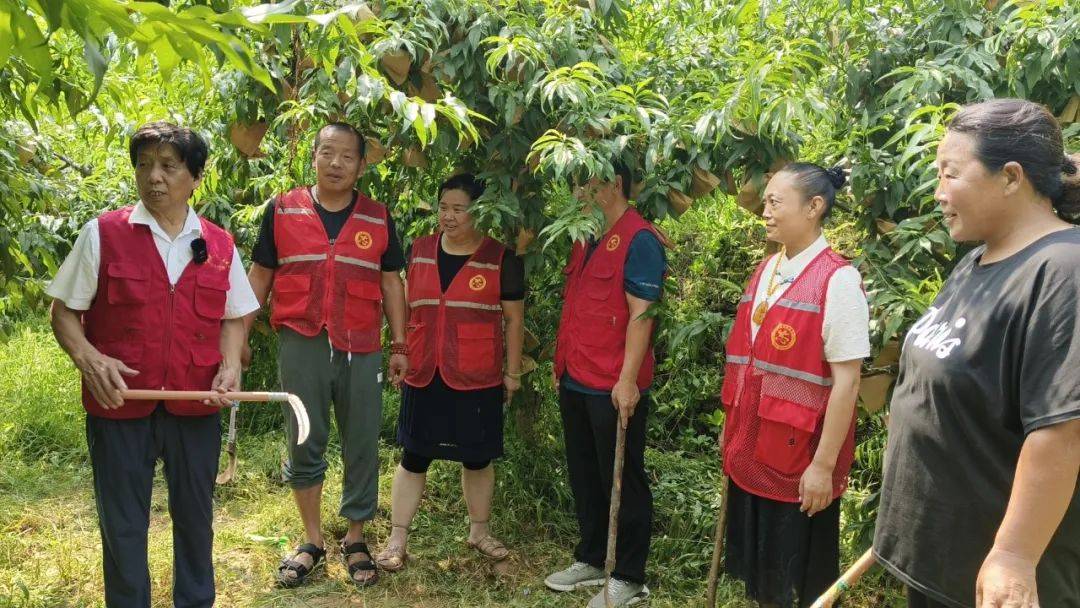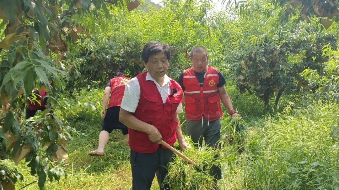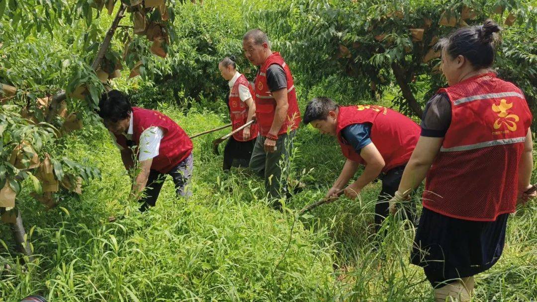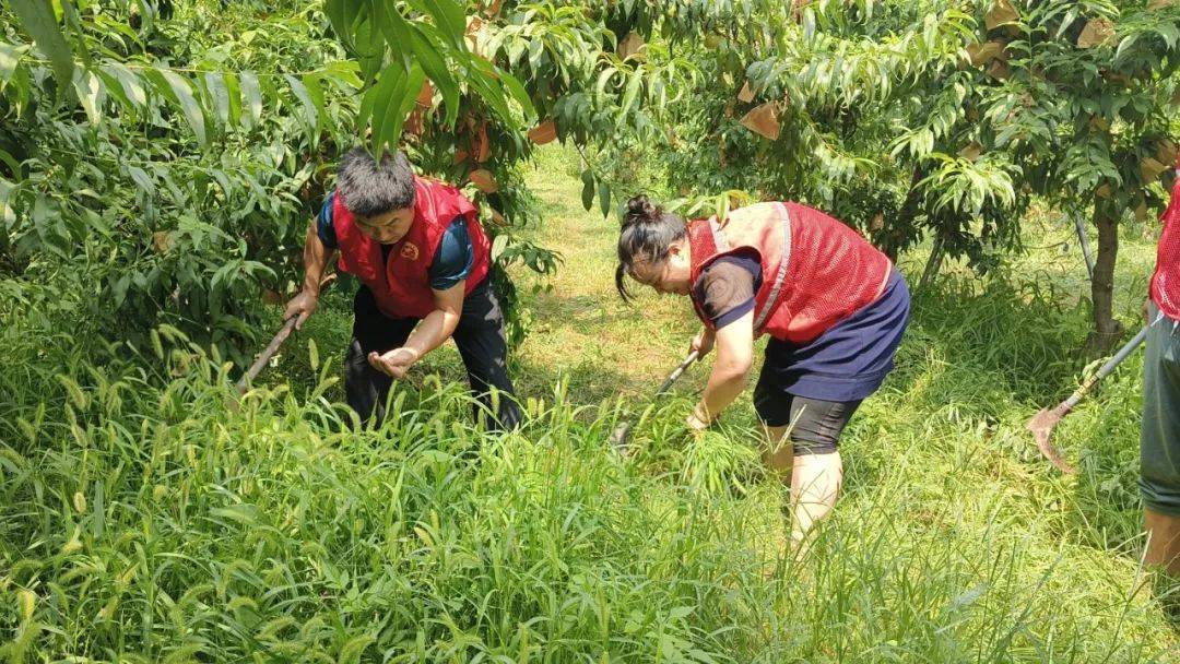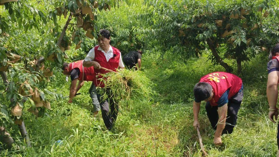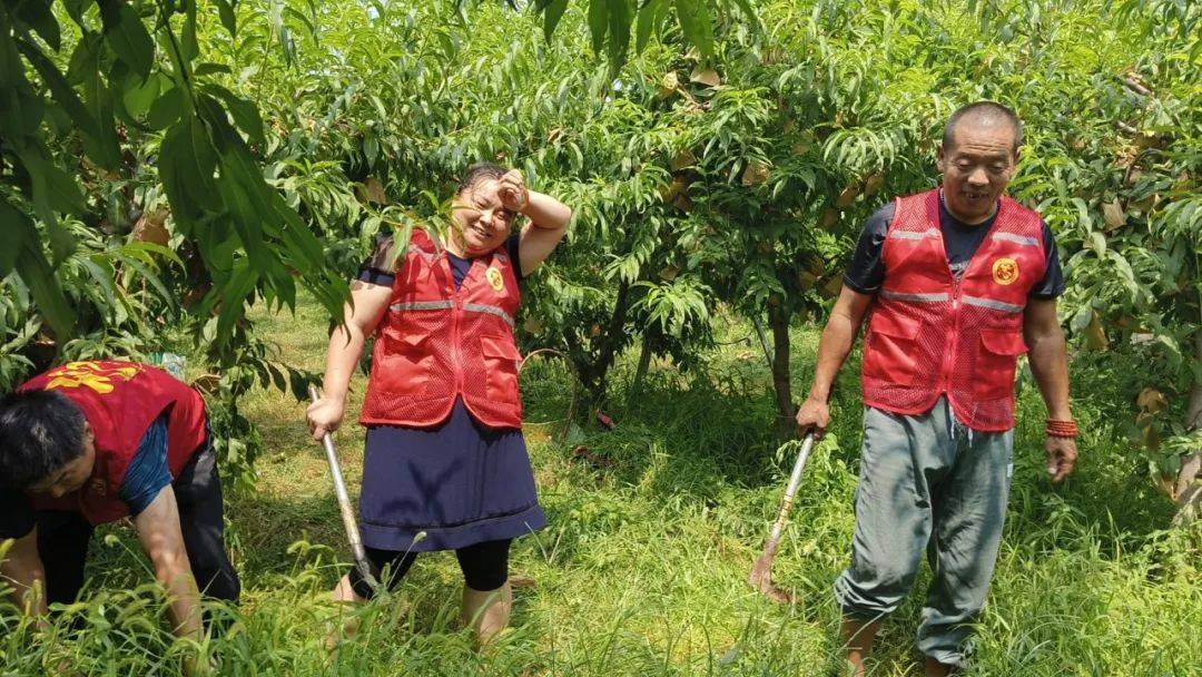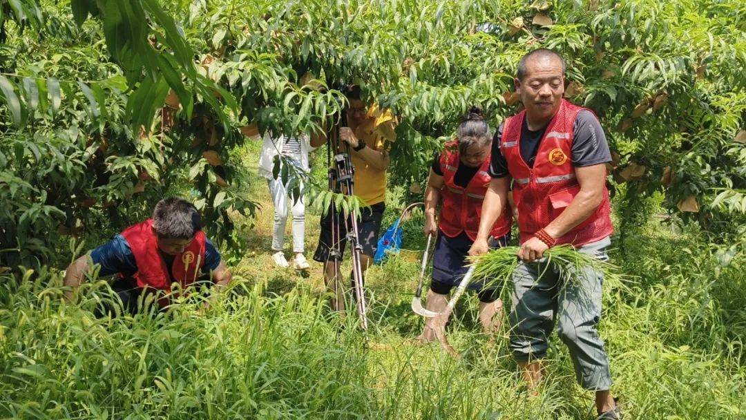 由于20多天来下雨不断,洪水把桃园低洼地冲毁了。志愿者们把冲毁的桃树地进行了加固,又在炎炎烈日下进行除草。