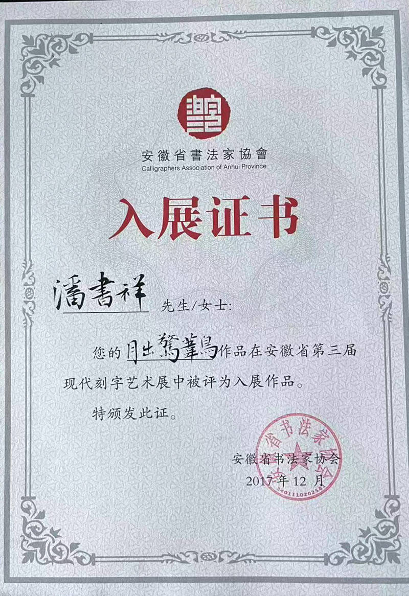 其作品获得安徽省书法家协会举办的艺术节金奖,同年获现代刻字入展证书。