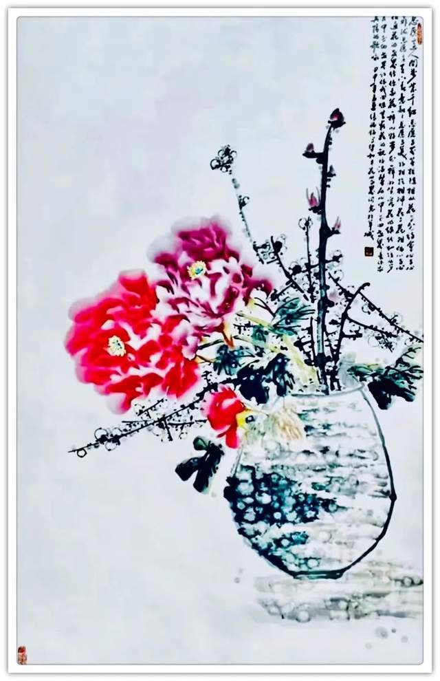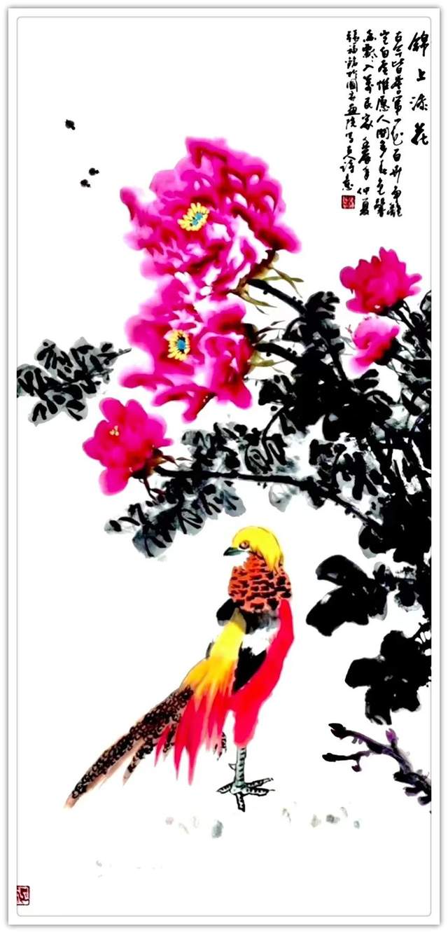 同样,他画其他花鸟作品也是文武兼备的证见!笔墨铿锵写意富贵牡丹,非仅富贵也!最有雄迈品!铁笔塑铁筋,雄墨写雄魂,骨法用笔,应物象形!再经过随类赋彩,就把牡丹画得既有君子之修,也有侠者之勇!他的画法刚则万分刚猛,雄则百倍雄强,给观赏者塑造起一个可以感受震撼力的艺术空间。在这个空间里游目骋怀,必然会心感铮铮!浓墨重彩,浑厚华滋,无限的审美张力,令他成为画坛的铁流派。唯有在军中得到身心熔锻,方得笔墨如此峥嵘!