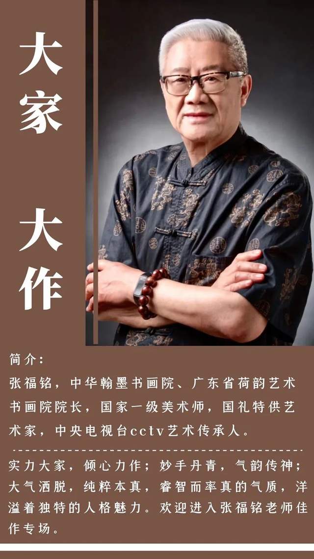 张福铭,笔名鲁剑,沂蒙山人,1950年出生,现定居广州。从军26年,毕业于石家庄高级陆军学校,并留校任校杂志社美术编辑、摄影记者。师承著名书法大师欧阳中石先生,进修于首都师大、广州美院、天津美院、中国国家画院、清华美院、中国书协、中国美协等高研班。有幸得到赵久长、詹庚西、郭石夫、王阔海、王奇寅、李振东、贾宝珉、周彦生、李双阳等老师的精心指导。现为中华翰墨书画院、广东省荷韵艺术书画院院长,国家一级美术师,国礼特供艺术家,中央电视台cctv艺术传承人,国家非物质文化艺术传承人,中国当代德艺双馨艺术家,人民艺术家,中国书协会员,中国美协会员,广东省书协、美协、影协会员,北京华夏冰雪书画院广州分院院长,广东省人民政府文史研究馆馆员,全域影视传媒集团艺术顾问,广州国际艺术博览会签约书画家,享受国务院政府特殊津贴专家。是一位集书法、绘画、摄影、篆刻于一体的实力派书画家。