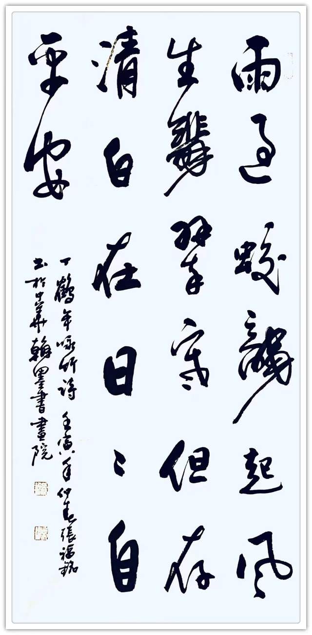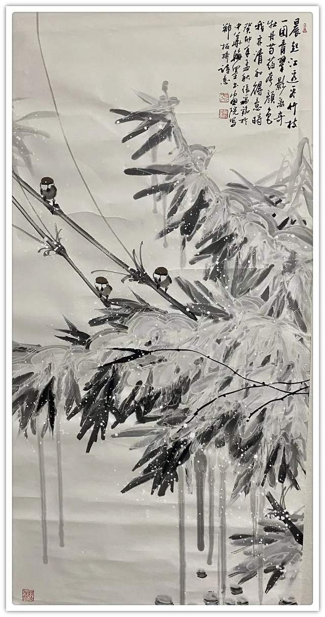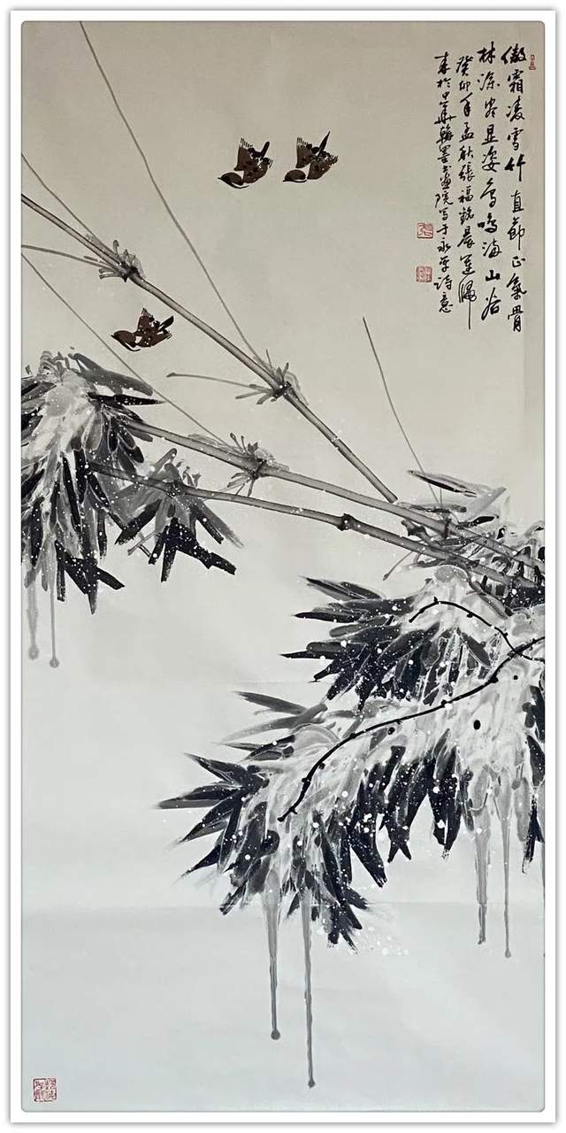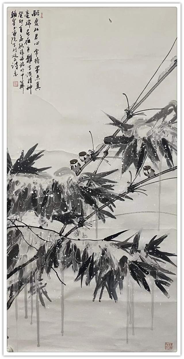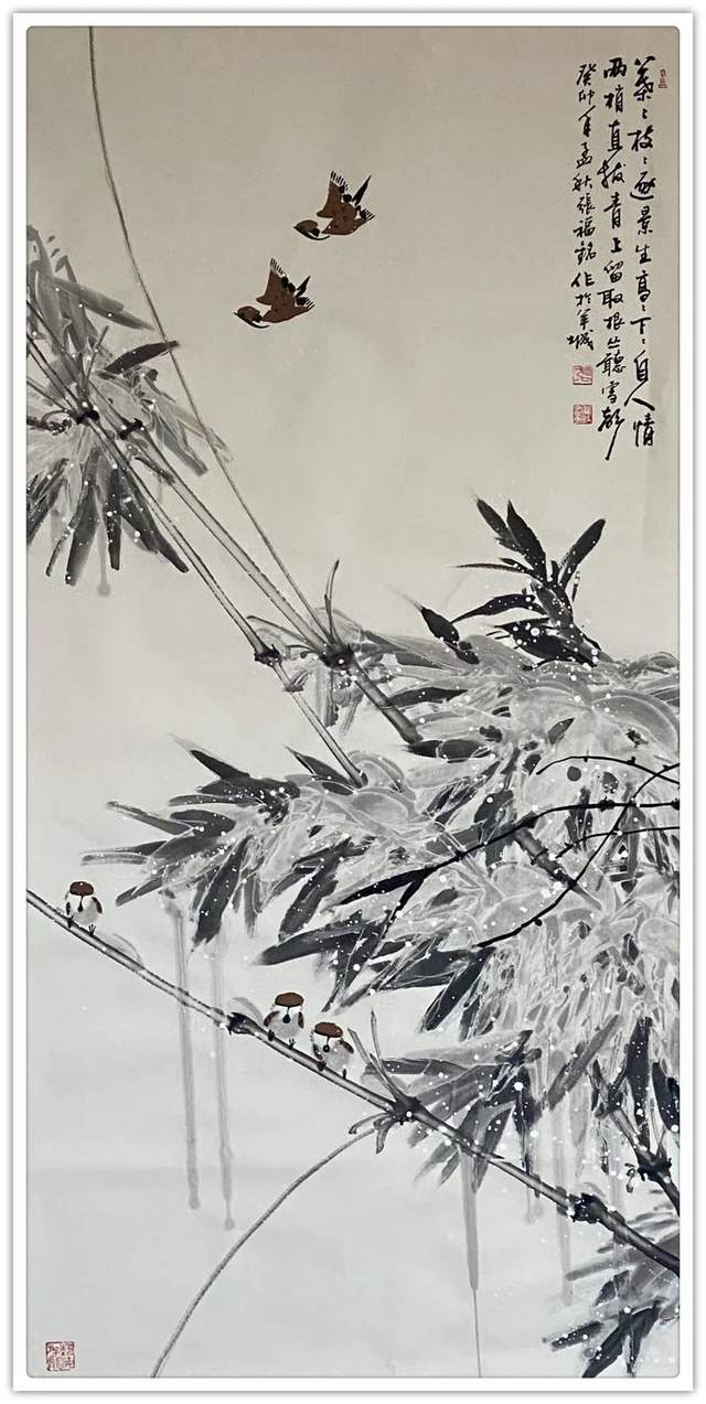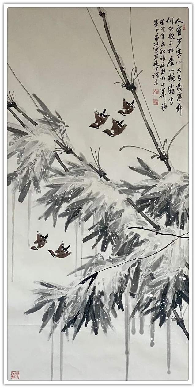他画画有军队生活给予的气势磅礴,也有文人修养带来的儒雅清芬,写意梅兰竹菊,也可以盈满诗情画意。一作一品,耐于读,神于观,看得人赏心悦目,醉享无限。又有博涉多优,奋笔作书法的精气神。诸书皆成,尤其一笔行草写得瘦硬有精神。磨砺书法,观尽前人笔墨奇迹,见地深刻,可以在起笔落笔之际,把行草作品写得遂心应手,天质自然!