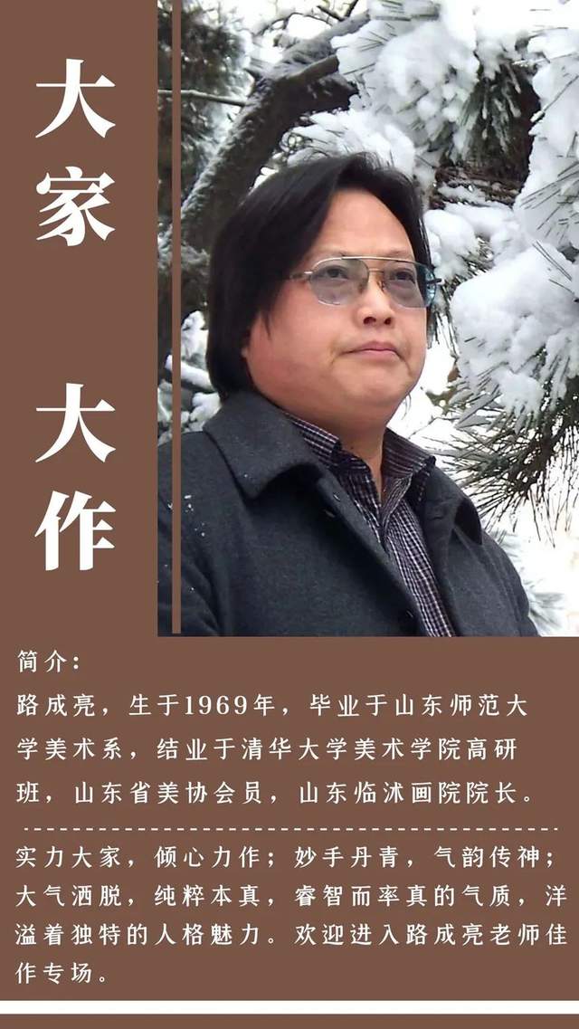 路成亮,生于1969年,毕业于山东师范大学美术系,结业于清华大学美术学院高研班,山东省美协会员,山东临沭画院院长。作品多次参加山东省画院、山东省美协、中国美协等举办的展览、赛事,作品及简历入编数十部辞书,发表于《中国彩墨艺术报》、《人民美术报》、《神州名人书画报》、《中国书画报》等,香港旅游经济台、山东卫视等播放专题记录片,出版《少儿学国画》、《路成亮国画作品集》、《中国当代艺术家——路成亮书画卷》、《中国高等美术院校名师教学范本—路成亮国画作品选》。