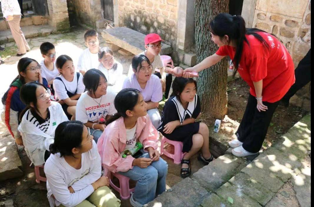 图为实践队队员参观韩钧故居,夏日炎炎,蝉鸣阵阵,大家在树下一起倾听讲解员关于韩钧将军的详细讲解。韩钧是新安县人,少年时期成绩优异,青年时期热血革命。韩钧于1933年在草岚子监狱加入中国共产党。1940年,任山西青年抗敌决死二纵队司令员、党委书记兼八路军第八军区司令员。