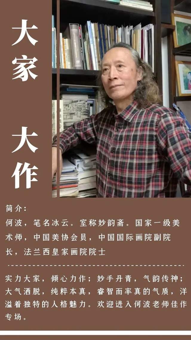 何波,笔名冰云。室称妙韵斋,1949年2月出生于辽宁渤海湾东岸小营子村。历经军旅生涯13年后转业地方工作。毕业于哈尔滨文学院,酷爱绘画、通音律、苦修文。精于山水,犹善画马,笔下之马游走于具象和抽象之间,形成独家画马符号,称之为“东方神骏”。