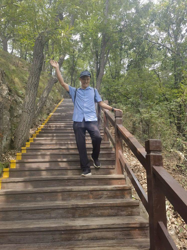 人常说“上山容易下山难”,下行半山腰,逐渐体力不支,汗湿衣衫,所带茶水皆尽,加上说话多,口干舌燥,膝盖酸疼,步履深沉,难以行进。此时此刻真正体验到人们常说的“上坡费气,下坡费腿”的滋味。眺望山下,台阶无尽,中途不前,怎么回家?